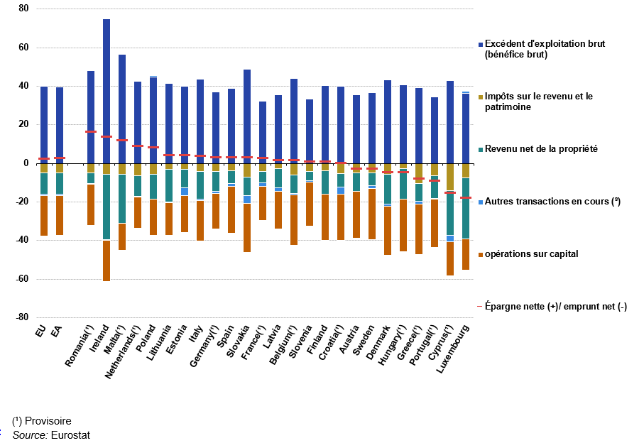 Le taux de marge est un indicateur de la rentabilité des entreprises.Ensuite l’EBE sert à distribuer des dividendes, à payer des impôts ou bien à investir. C’est donc en partie un indicateur de la financiarisation. Ce taux a été assez stable dans l’UE, oscillant autour de 40 % entre 2000 et 2020. En 2020, la part de profit la plus élevée des entreprises a été constatée en Irlande (77,6 %). Le taux le plus faible a été observé en France (31,8 %).