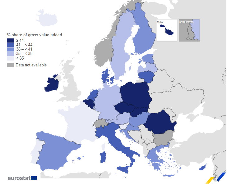 The gross operating surplus (GOS) as a share of their gross value added, is an indicator of businesses’ profitability. GOS is then used to distribute dividends, pay taxes, or invest. It is therefore partly an indicator of financialization. This rate has been quite stable in the EU, fluctuating around 40 % in the period 2000 to 2020. In 2020, the highest profit share of businesses was observed in Ireland (77.6 %). The lowest rates were found in France (31.8 %).