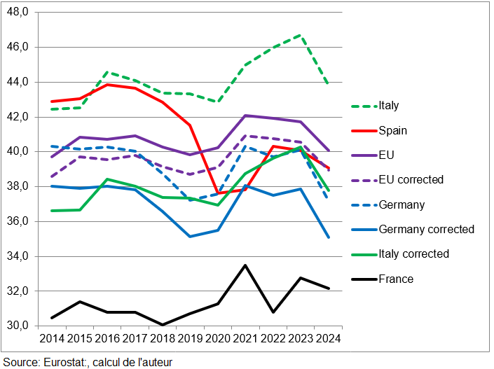 ° Il reste que la France est le pays où le taux de marge (EBE / VA) des sociétés non financières (SNF), rapport entre l’excédent brut d’exploitation, qu’on peut assimiler au profit, et la valeur ajoutée est le plus faible dans les pays de l’OCDE, ainsi que la Chine et le Brésil. Il est de 32,7% en 2023 en France (32,2% en 2000), soit en dessous du Royaume-Uni (33,7%) des États-Unis (34,9% en 2022) mais surtout de l’Allemagne « rectifié » des non salariés (36,9%) de l’Italie « rectifié » (39,3%) de l’UE « rectifié » (40%) et d’autres pays pays dont la Chine (44,4% en 2020) ou le Brésil. On rappelle que le profit (EBE) est mesuré ici sur le territoire français, par exemple l’EBE d’une multinationale française.