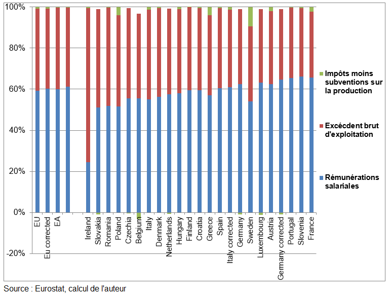 ° Si on veut éviter cette question des non-salariés en Italie et en Allemagne, on peut comparer les comptes d’exploitation de l’ensemble de l’économie où le numérateur du taux de marge inclut l’EBE des autres secteurs institutionnels, comme par exemple celui des ménages propriétaires de leur logement (loyers imputés), ainsi que le revenu mixte des entreprises individuelles. Les résultats sont quasiment les mêmes : le taux de marge de la France est juste plus élevé que celui de la Suède. Encore cette supériorité est due à l’EBE des loyers imputés qui est assez mal mesuré (voir chapitre 7).