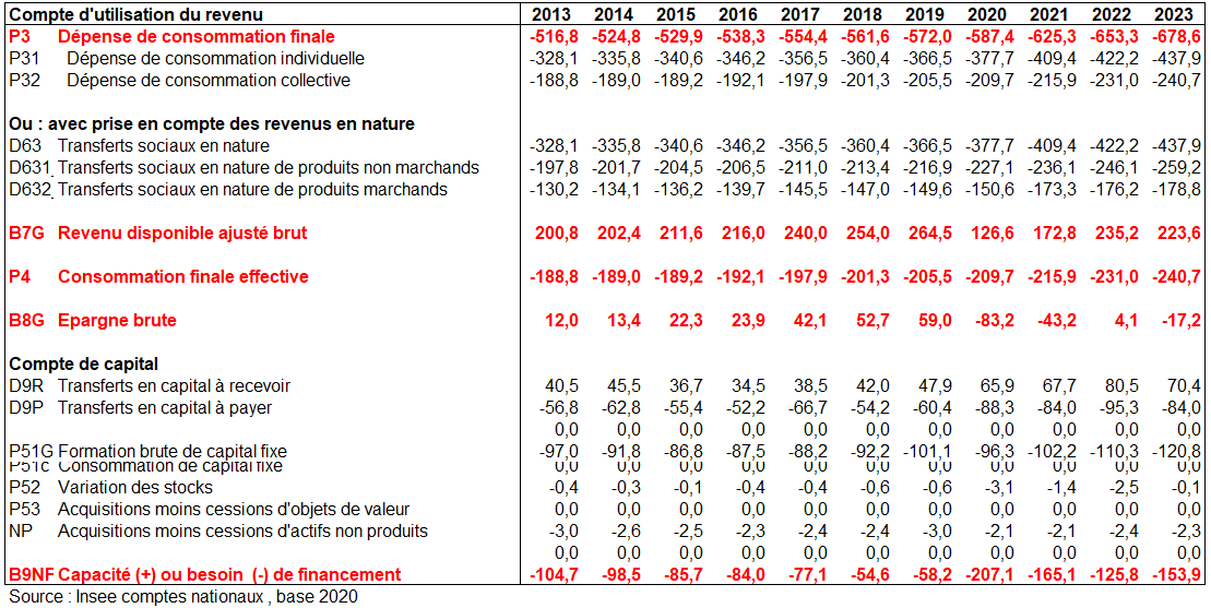 Outre leur consommation intermédiaire (P.2, dans le compte de production), les administrations publiques ont une consommation finale effective (P.4) et, plus importante, une dépense de consommation finale (P.3).