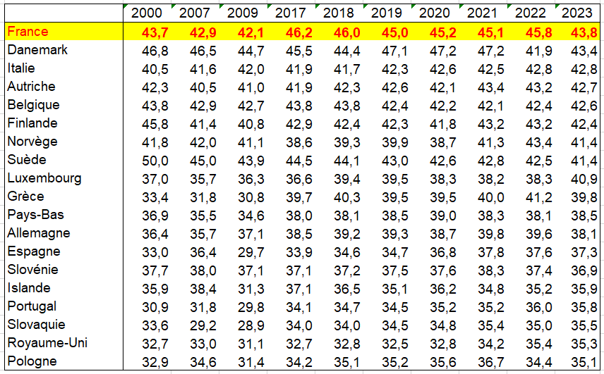 On peut quand même établir des pourcentages à partir des données d’Eurostat sur les tableaux entrées-sorties (TES). Les données de l’Allemagne sont manquantes. Les services de santé, d’éducation et même d’action sociales peuvent comprendre certes des services produits par des entreprises privées ou des institutions privées (cliniques privées, médecins, dentistes,etc,…) Il n’en demeure pas moins vrai que le pourcentage total est un des plus élevé en Europe (30%), un peu moins que dans les pays nordiques. La part de services administratifs est aussi une des plus élevée : 9% comme en Grèce, un peu moins qu’en Hongrie, mais plus qu’en Suède et au Danemark.
