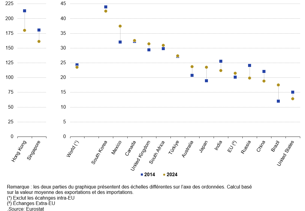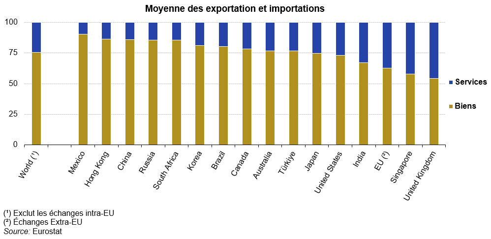 L’UE a enregistré un excédent commercial pour les biens (368 milliards d’euros) en 2024 et un excédent légèrement inférieur pour les services (194 milliards d’euros) ; Singapour a connu une situation similaire. À l’inverse, le Japon, le Mexique et le Canada ont enregistré un déficit commercial tant pour les biens que pour les services.