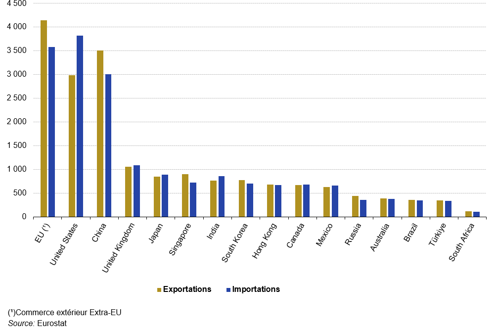 Les échanges de biens et de services les plus importants ont été enregistrés dans certaines des plus grandes économies. En 2024, l’UE a exporté davantage de biens et de services (4 140 milliards d’euros) que tout autre pays et a enregistré le deuxième niveau d’importations le plus élevé (3 580 milliards d’euros), derrière les États-Unis (3 820 milliards d’euros).