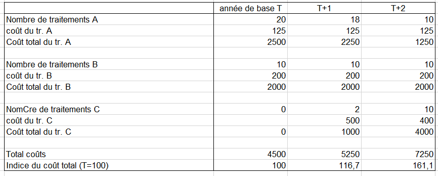 En pratique, il faut disposer d’une mesure des quantités à un niveau de postes fin et dans une nomenclature qui soit la même entre l’année de base et l’année considérée (par exemple une version de la nomenclature des Groupes homogènes de malades, GHM). Si cette condition n’est pas remplie, un travail préliminaire de reclassement doit être effectué pour disposer d’une nomenclature constante, comme cela est fait dans le cas des GHM lors des changements de nomenclature.