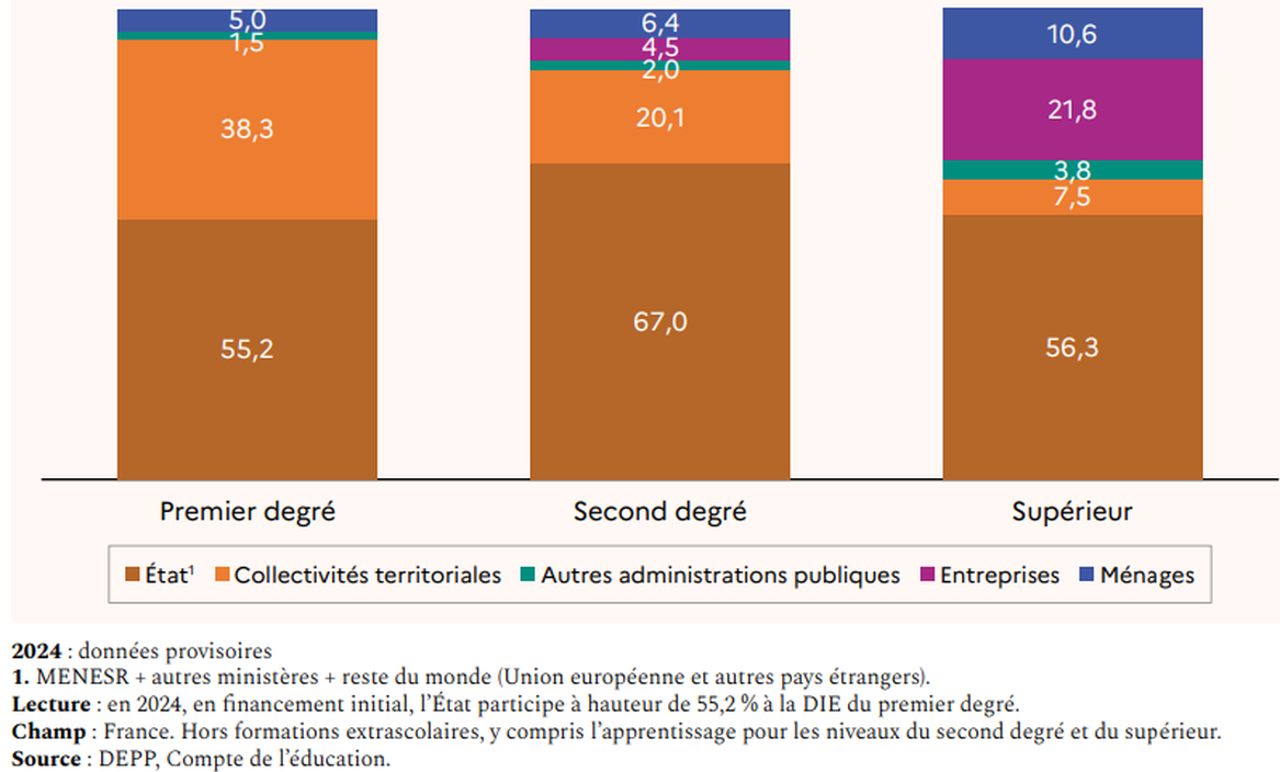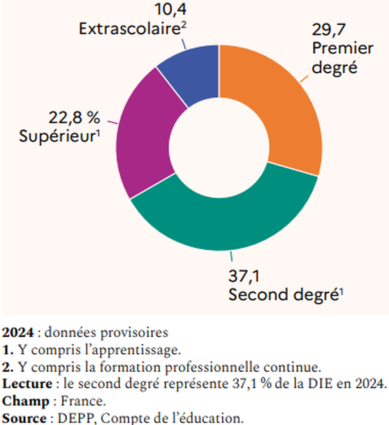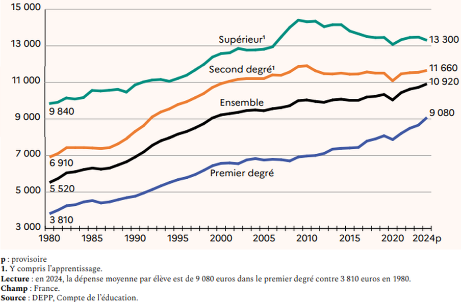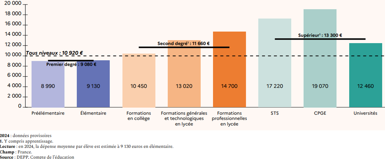 « Mais c’est surtout la structure de la dépense d’éducation qui interroge. L’enseignement secondaire en absorbe en effet près de 40 %. Cela se fait notamment au détriment de l’enseignement supérieur : la dépense par étudiant a diminué d’environ 10 % depuis 2010, entraînant d’immenses difficultés pour les universités alors qu’elles accueillent un public de plus en plus important (https://www.alternatives-economiques.fr/education-mauvais-calculs-de-france/00107903).