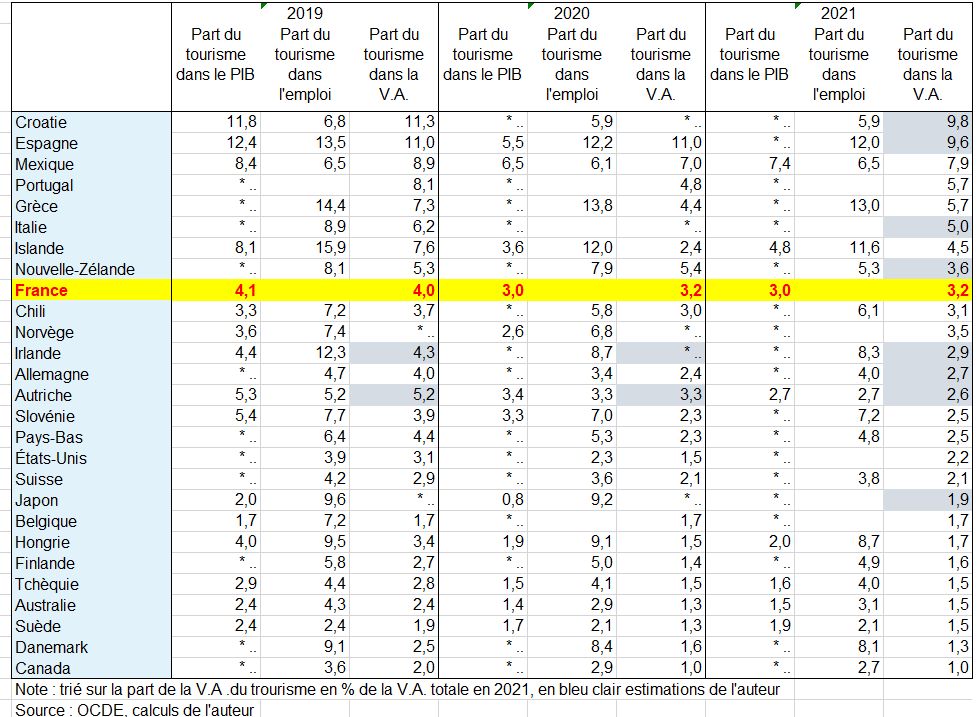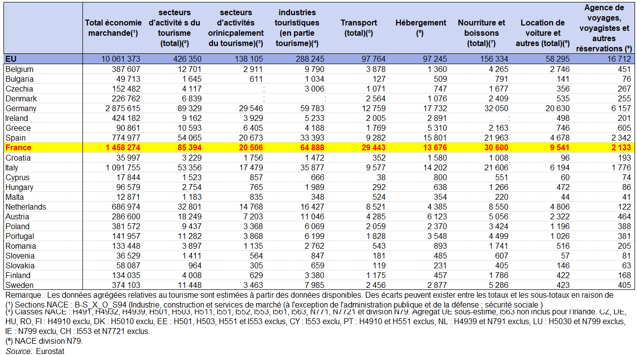 ° Une autre mesure de la contribution du tourisme à une économie est la part de la valeur ajoutée brute directe du tourisme dans la valeur ajoutée brute totale. La part du tourisme dans la valeur ajoutée brute totale varie de 1,9 % au Luxembourg à 11,3 % en Croatie en 2019. Cette part était de 4% pour la France, de plus de 8 % pour l’Espagne, et 9,5 % en Islande. La moyenne pour l’UE était de 4,5 %. En termes absolus, la valeur ajoutée brute directe du tourisme a été estimée à 572 milliards d’euros en 2019, dont 124 milliards d’euros pour l’Allemagne, suivie de l’Italie (100 milliards d’euros), de la France (87 milliards d’euros) et de l’Espagne (78 milliards d’euros).