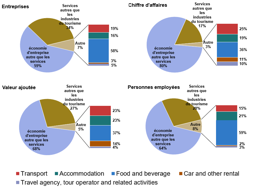 Les parts des industries touristiques dans le chiffre d’affaires total et la valeur ajoutée au coût des facteurs étaient relativement plus faibles, les industries touristiques représentant 2,5 % du chiffre d’affaires et 3,6 % de la valeur ajoutée de l’économie marchande non financière. Ces chiffres reflètent très probablement – entre autres explications – la proportion plus élevée de micro, petites et moyennes entreprises et le niveau d’emploi à temps partiel dans de nombreuses industries du tourisme.