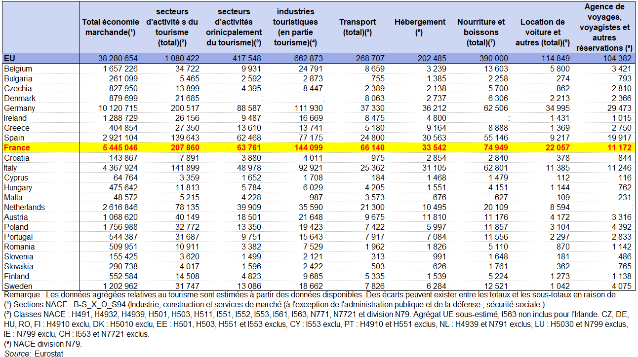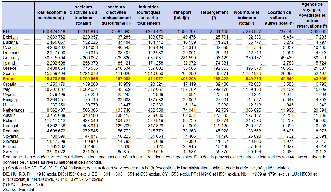 les secteurs d’activités touristiques ne fournissent pas de services uniquement aux touristes. Leur emploi, leur chiffre d’affaires, etc., sont également liés aux services fournis aux non-touristes. Dans les tableaux suivants, la subdivision « principalement tourisme » et « partiellement tourisme » en tient compte. Par exemple, 3,1 millions de personnes de lU.E. sont employées dans des secteurs d’activité « principalement touristiques » (transport aérien de passagers, services d’hébergement et agences de voyages et voyagistes) censées desservir principalement les touristes, tandis que 9,2 millions de personnes sont employées dans des secteurs d’activité « en partie touristiques » où les clients sont susceptibles d’être un mélange de touristes et de non-touristes (par exemple, les restaurants).