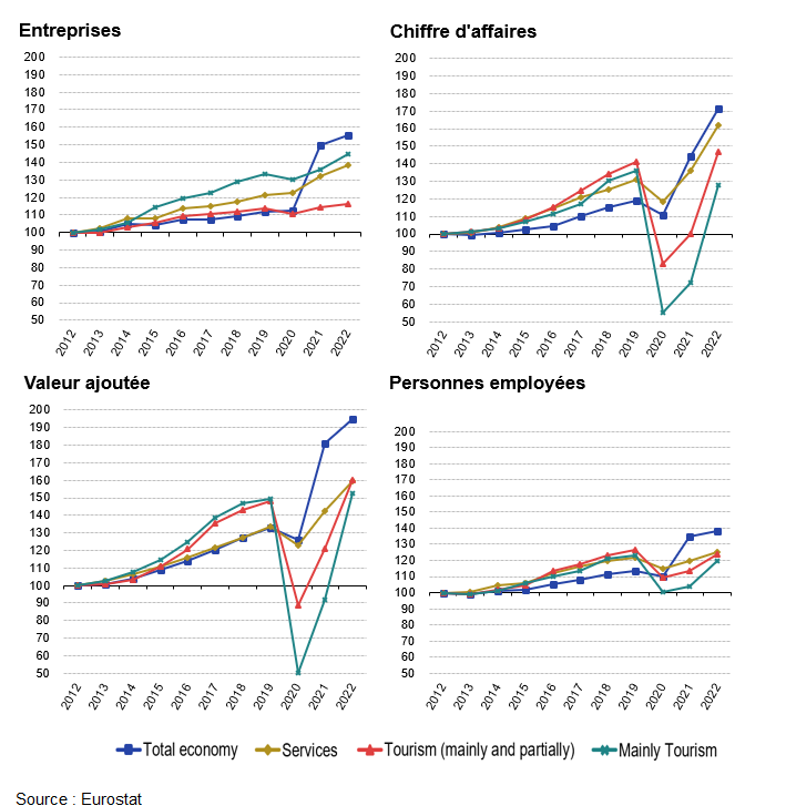 Jusqu’en 2019, les industries du tourisme (principalement et partiellement) ont affiché une croissance beaucoup plus forte que l’économie totale pour tous les indicateurs concernés. Mais en 2020, l’impact de la pandémie de COVID-19 a entraîné des baisses spectaculaires du chiffre d’affaires et de la valeur ajoutée des industries du tourisme (-41,0 % et -40,1 % respectivement, par rapport à 2020 et 2019). Le nombre de personnes employées dans les industries du tourisme et le nombre d’entreprises ont diminué moins fortement, mais ont tout de même enregistré des niveaux respectivement inférieurs de 2,8 % et 13,5 % en 2020 par rapport à 2019. Une lente reprise a commencé en 2021, lorsque tous les indicateurs ont montré une augmentation allant jusqu’à 1,3 % par rapport à 2020. En 2022, les industries du tourisme ont dépassé les niveaux d’avant la pandémie de 2019 de 2,3 % en nombre d’entreprises, de 3,9 % en chiffre d’affaires net et de 8,0 % en valeur ajoutée, mais elles n’ont toujours pas atteint le niveau de 2019 en termes de personnes occupées (-2,2 %). Si l’on compare 2022 à l’année précédente on constate une augmentation de la quasi-totalité des activités liées au tourisme, ainsi que de l’ensemble de l’économie marchande.