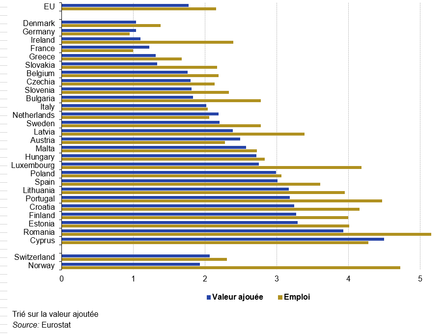 En 2020, les États membres ayant les plus fortes proportions — tous les 7 % ou plus de la VAB totale — étaient la Finlande (7,5 %), la Lituanie et la Roumanie (7,3 %), la Pologne (7,2 %), l’Autriche et la Lettonie (7,0 %).