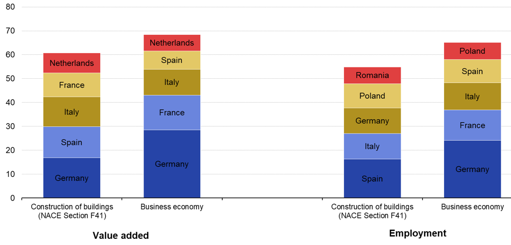 One way of measuring the size of the construction sector is through the bgross value added (GVA) generated by this economic activity as a share of total GVA. This share was between 5 and 6 % in the EU in the period 2010 to 2020. It was highest at 5.8 % in 2010, falling to 5.1 % in 2014 to 2017 and then increasing again to reach 5.6 % in 2020.