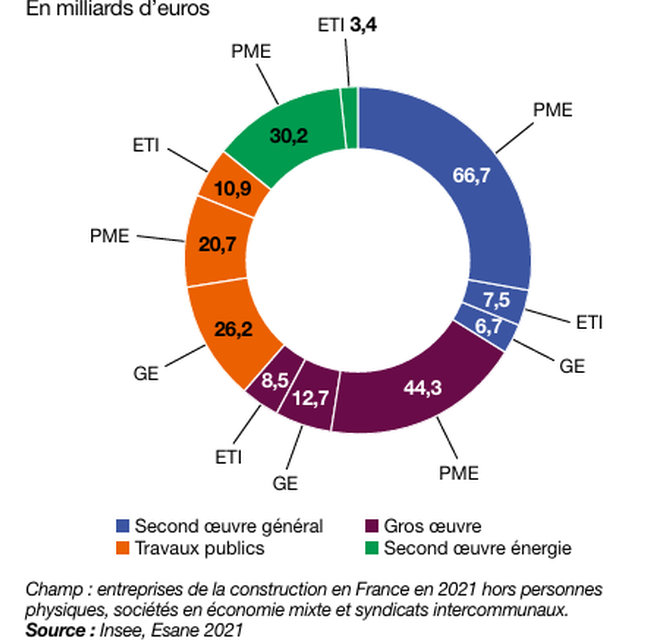 Le secteur de la construction regroupe les entreprises du bâtiment (gros œuvre et second œuvre) et des travaux publics. Le second œuvre représente près de la moitié du chiffre d’affaires net de la sous-traitance (34,1 % pour le second œuvre général et 14,1 % pour le second œuvre énergie), devant le gros œuvre (27,5 %) et les travaux publics (24,3 %). Le secteur de la construction se caractérise par une structure d’activité peu concentrée : 270 000 petites et moyennes entreprises (PME) réalisent plus des deux tiers du chiffre d’affaires net en 2021 (68,1 % dont 31,6 % pour les très petites entreprises). Elles sont fortement représentées dans le second œuvre (général et énergie) dont elles assurent plus de 80 % du chiffre d’affaires net (graphique suivant). Les 300 entreprises de taille intermédiaire (ETI) et grandes entreprises (GE) représentent un tiers du chiffre d’affaires net (12,8 % pour les ETI et 19,2 % pour les GE), soit beaucoup moins que dans l’ensemble des secteurs marchands non agricoles et non financiers (deux tiers environ). Ces entreprises sont particulièrement présentes dans les travaux publics où elles assurent 64,1 % du chiffre d’affaires net. Ce secteur représente à lui seul 57,4 % du chiffre d’affaires net des grandes entreprises et 35,9 % de celui des ETI.