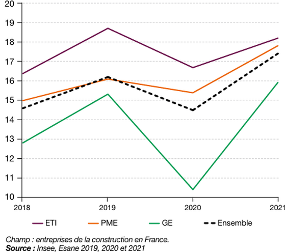 Comme l’ensemble des entreprises de la construction, les PME ont connu une baisse de leurs marges brutes en 2020, mais celle-ci a été plus limitée que celle des entreprises de plus grande taille (15,4 % de la valeur ajoutée pour les PME en 2020, après 16,1 % en 2019). La baisse de leur taux de marge en 2020 a notamment été contenue (pour 0,7 point environ) par la Source : Insee, Esane 2019, 2020 et 2021 2021 Les grandes entreprises et dans une moindre mesure hausse des subventions d’exploitation dont elles ont bénéficié dans le cadre des aides exceptionnelles liées à la crise sanitaire (fonds de solidarité et prise en charge du chômage partiel). En 2021, la remontée du taux de marge (+ 2,4 points) a été également soutenue (à hauteur de + 0,6 point environ) par le maintien à un niveau élevé des subventions d’exploitation. les ETI, qui n’ont pas bénéficié de subventions d’exploitation de même niveau, présentent des évolutions plus accentuées du taux de marge avec une forte baisse en 2020 (- 4,9 points pour les GE et – 2,0 points pour les ETI) suivie d’une nette remontée en 2021 (+ 5,5 pour les GE et + 1,5 point pour les ETI) – (graphique suivant)
