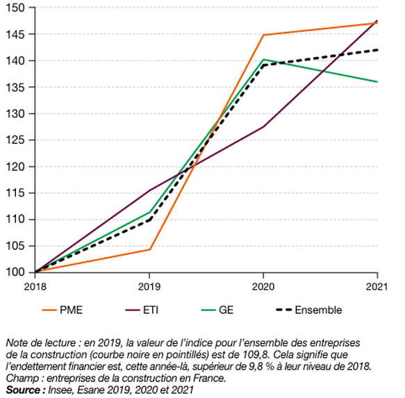 Évolution de la dette financière brute (de plus d’un an) des entreprises de la construction entre 2018 et 2021 selon la catégorie d’entreprise Indice 100 en 2018
