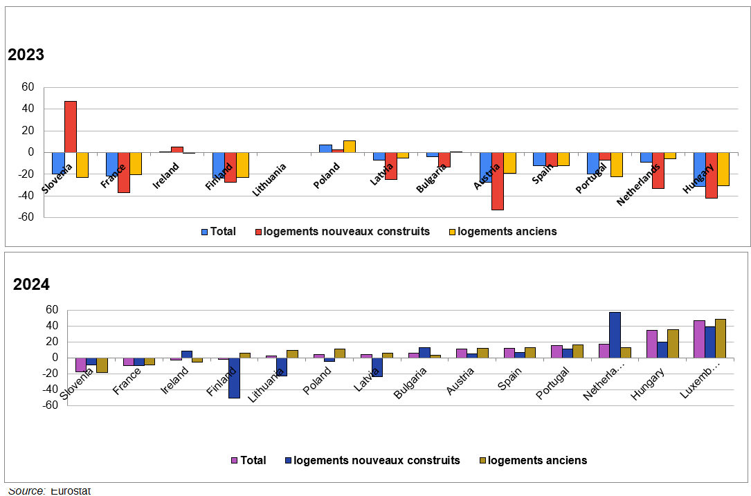 Pour les logements neufs, le nombre de transactions a le plus augmenté aux Pays-Bas (+57,3 %) et au Luxembourg (+39,3 %), et a le plus diminué en Finlande (-50,4 %) et en Lettonie (-24,0 %). Concernant les logements existants, la plus forte hausse du nombre de transactions a été observée au Luxembourg (+48,2 %) et en Hongrie (+35,8 %), tandis qu’il a diminué uniquement en Slovénie (-18,5 %), en France (-9,3 %) et en Irlande (-5,3 %).