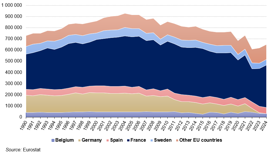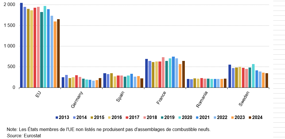 Seuls cinq pays de l’UE ont produit des éléments combustibles neufs en 2024 : l’Allemagne, l’Espagne, la France, la Roumanie et la Suède (voir tableau 4 et figure 2), soit une baisse globale de 19,4 % entre 2013 et 2024. La Suède a enregistré la plus forte baisse de production d’éléments combustibles neufs au cours de la dernière décennie (-37,1 %), suivie de l’Espagne (-35,0 %), de l’Allemagne (-9,0 %) et de la France (-7,6 %). La Roumanie a quant à elle enregistré une hausse de 2,2 %.