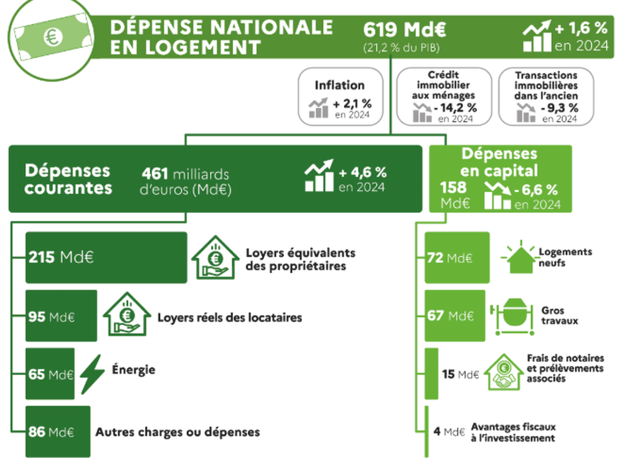 Les emplois totaux des unités résidentes sont la somme des cinq premières composantes. Il faut en déduire la partie financée par le reste du monde moyennant des transferts ou des prêts, afin d’aboutir aux dépenses de la Nation. Celles-ci sont donc égales aux emplois totaux des unités résidentes qui sont financés par des unités résidentes.