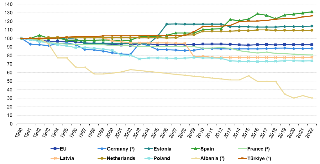 L’indice de niveau de prix pour les transports couvre aussi les prix des équipements (tels que les véhicules), le fonctionnement de l’équipement (carburant, pièces détachées et réparations) ainsi que les services (tels que les services de transport). Les prix augmentent en France comme dans l’UE (134,5 en 2023 base 100 en 2010). Le prix relatif des transports augmente toutefois plus en France que dans les autres pays sauf en Italie (indice : 108,5 en France en 2023 base 100 en 2010 contre 104,4 dans l’UE).