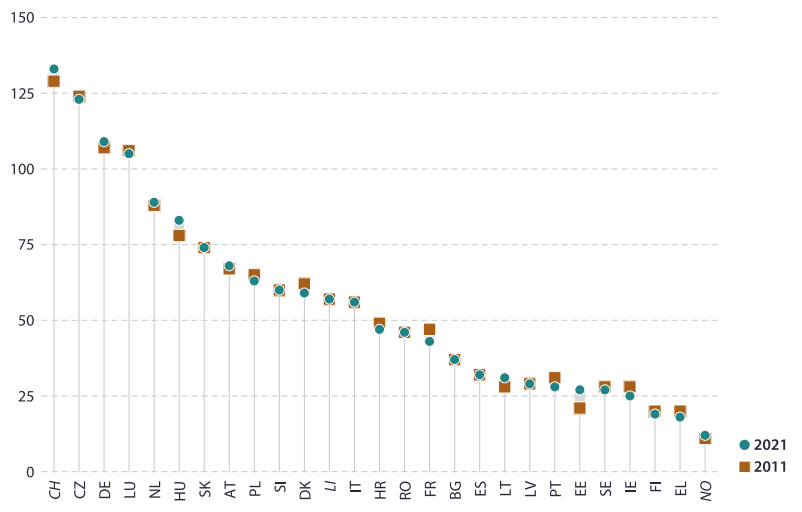 Le niveau de prix le plus élevé a été de loin enregistré au Danemark, tandis que les plus bas ont été enregistrés en Bulgarie, en Roumanie et en Pologne. Un indice de prix met en évidence les différences de prix entre les pays. Les données présentées ici ont un indice de 100 comme prix moyen pour l’UE. Si l’indice de prix d’un pays est supérieur à 100, le pays concerné est relativement cher par rapport à la moyenne de l’UE ; s’il est inférieur à 100, le pays est relativement bon marché par rapport à la moyenne de l’UE. L’indice de prix des transports couvre les prix des équipements (tels que les véhicules), de leur fonctionnement (tels que le carburant, les pièces détachées et les réparations) ainsi que des services de transport (tels que les billets).