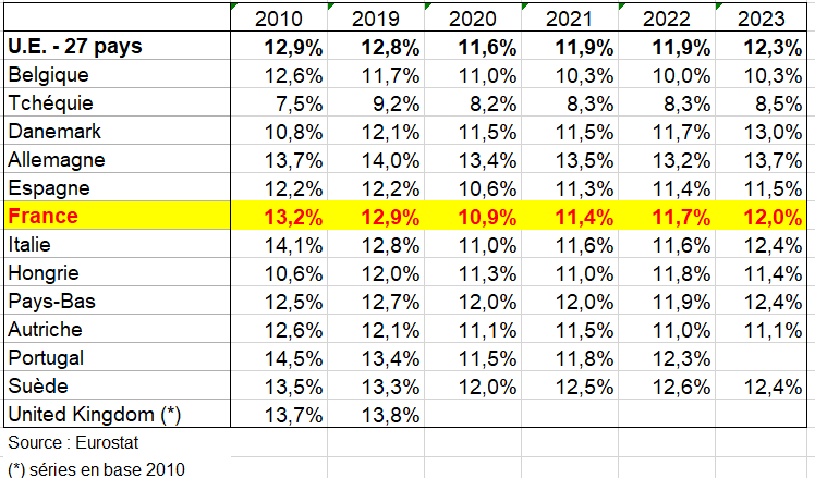 - Le coefficient en valeur en 2022 diminue de 1 point par rapport 2000 (12,8 %), 13,8% en 2000. Le coefficient en valeur est le même que celui de la zone Euro (12,8%) où il baisse aussi d’à peu près d’un point.