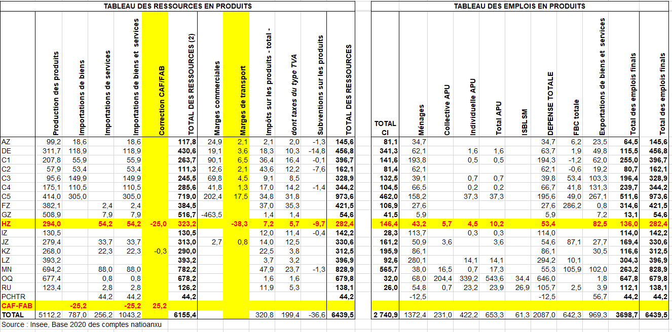 On présente les méthode de calculs des services de transport dans la page Échanges extérieurs. On se contente ici de rappeler la délicate mesure dans les comptes nationaux de la correction CAF-FAB et en sachant qu’il n’ y pas qu’elle qui pose des soucis de cohérence entre la Balance des Paiements et les comptes nationaux. Le processus de la fabisation en est un autre exemple. L’articulation au sein du TES entre le service de transport des biens en cours d’importation et les échanges de biens est décrite dans les tableaux ci-dessous. On s’appuie sur les données de l’année 2022 en base 2020.