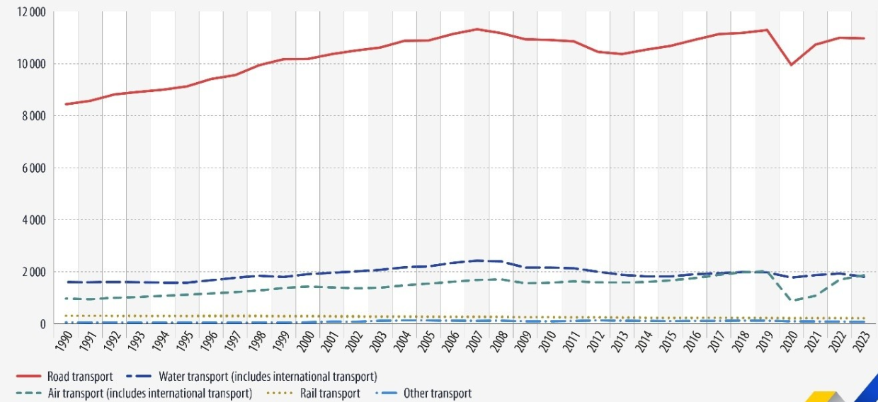 En valeur, 12,8 % de la consommation totale des ménages les dépenses dans l’UE ont été consacrées aux transports en 2022, en légère baisse contre 12,9 % en 2010. En se concentrant sur les plus récentes années, la part du transport dans la consommation des ménages dans l’UE a diminué en 2020 mais a augmenté en 2021 et 2022. La plupart des États membres de l’UE (20 sur 27) ont déclaré une part plus faible de la consommation des ménages en dépenses consacrées au transport en 2022 qu’en 2012. Les baisses les plus importantes, en points de pourcentage, ont été observé en Irlande, en Belgique et en Bulgarie, tandis que les augmentations les plus importantes ont été enregistrées en Slovénie, en Grèce et Lituanie. En 2022, la Slovénie a déclaré la plus grande part des dépenses de consommation des ménages consacrées aux transports (17,5 %), tandis que la Slovaquie avait la part la plus faible (5,6 %).