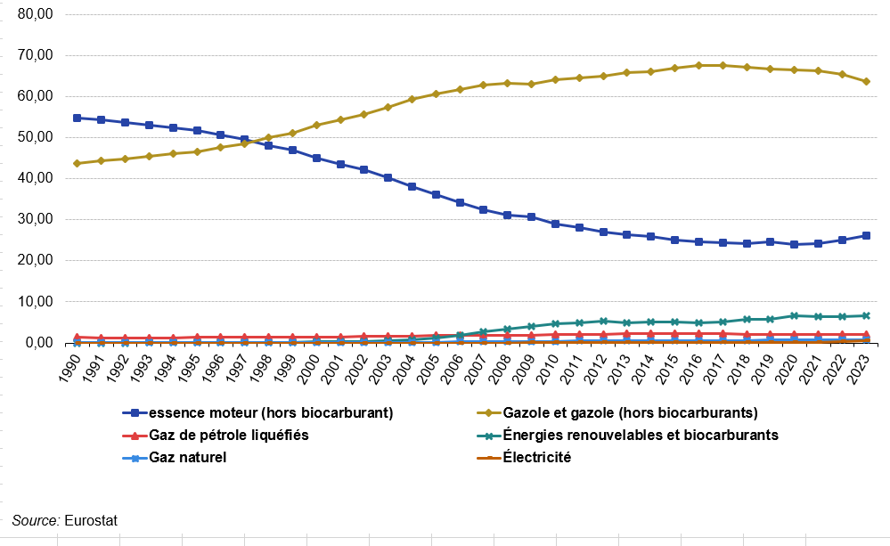 Dans la suite du texte on étudiera la dépense de consommation finale. On rappelle les grandes évolutions en France en valeur. Le poids du poste des dépenses de transport dans le budget des ménages (dépenses de consommation finale) a progressé fortement entre 1960 (11 %) et 1990 (17 %), puis a baissé (13,6 % en 2023). En 2023, la part dans la consommation effective totale est de 9,7 % (voir ci-dessus) contre 13,7% en terme de dépense de consommation finale. Mais comme cette dernière, le coefficient budgétaire de la consommation effective des ménages de la fonction transport gagne plus de 2 points en volumes chaînés entre 1959 et 2023.