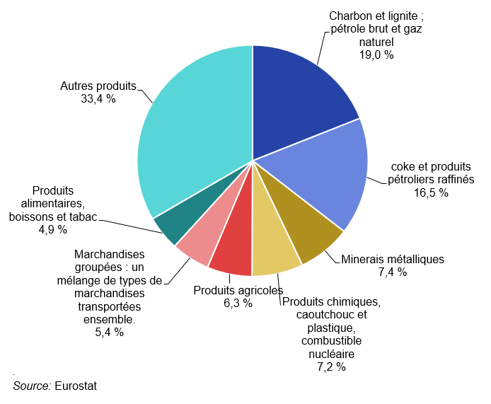 En 2022, le transport de marchandises avec 120,1 milliards d’euros de chiffre d’affaires, représentait 42 % de l’ensemble des transports et entreposage (22 % pour le transport routier de fret et services de déménagement et 20 % pour les autres transports de marchandises) – (tableau suivant). Les autres services de transport pesaient pour 32 % et le transport de voyageurs pour 26 % (le transport ferroviaire de voyageurs représentant à lui seul 10 % du chiffre d’affaires du secteur transports et entreposage).
