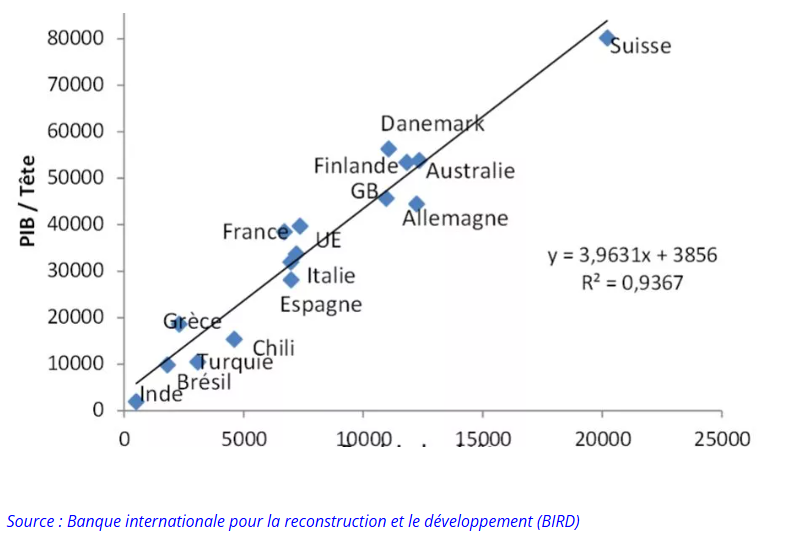 ° Or l’industrie joue un rôle clé dans la création de richesse. La relation existant, dans différents pays, entre leur production industrielle et le PIB par tête des habitants est évidente. C’est ce que montre le graphique ci-dessous où il est pris, en abscisse, pour variable explicative, la production industrielle des pays calculée par habitant, et, en ordonnées, les PIB/habitant de ces pays. On voit que la France avec une production industrielle faible de 6.432 US$ par habitant a un PIB/habitant de seulement 39.030 US$ ; l’Allemagne avec un ratio bien meilleur de 12.279 US$ a un PIB/tête de 46.208 US$, et la Suisse avec un chiffre record de 22.209 dollars en est à un PIB/tête de 87.097 dollars, le plus fort d’Europe. Notre secteur industriel ne concourt plus que pour 10 % à la formation du PIB, alors que ce taux devrait se situer pour le moins à 18 % ; l’Allemagne ou la Suisse en sont à 23% ou 24 %.