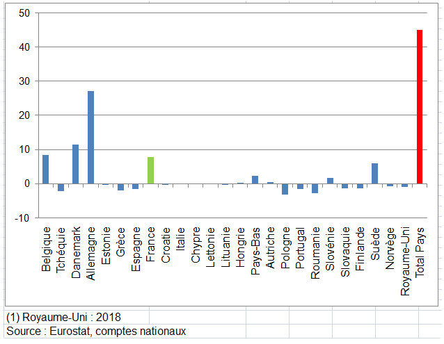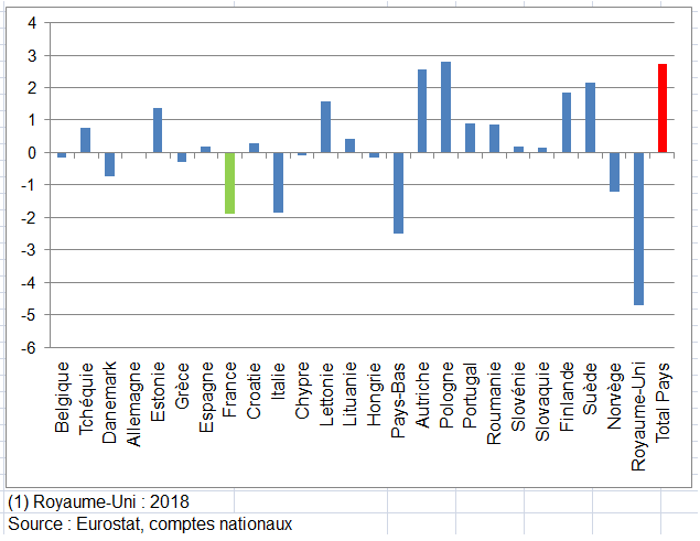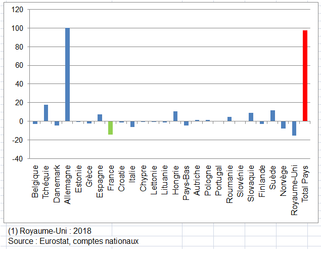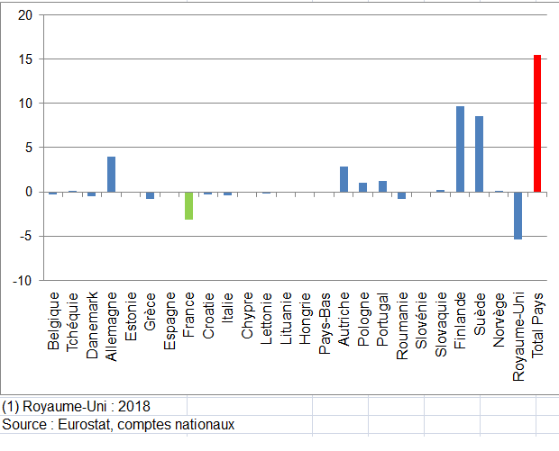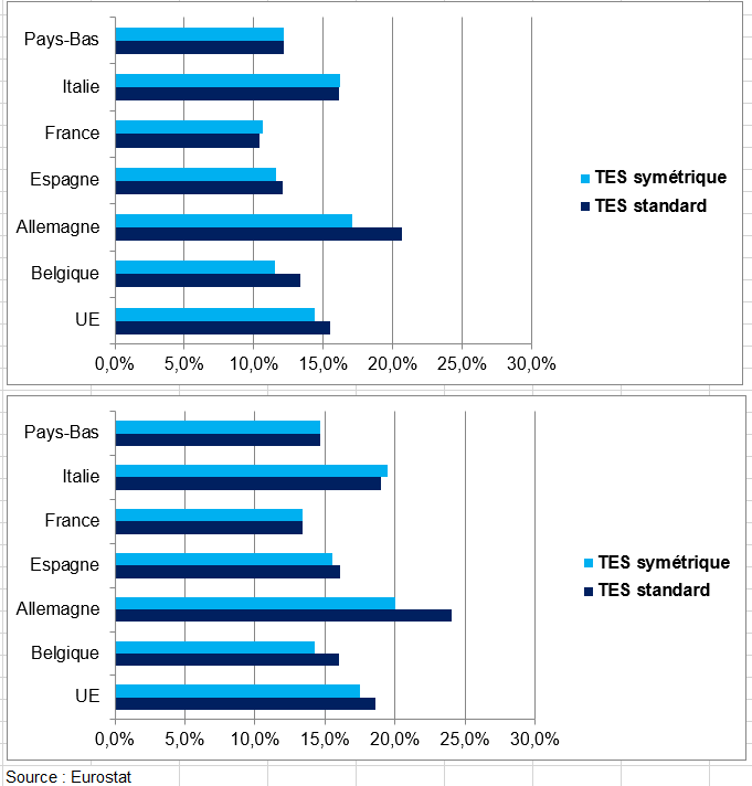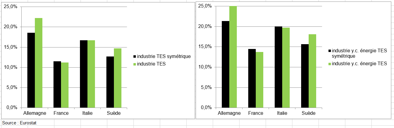 ° Le TES français en branche pure minore celle-ci de l’ordre d’un peu moins de 1% en 2020. Dans les autres pays, l’industrie inclut les activités secondaires de services et de commerce (voir page Tableau ressources emplois). En France, leur proportion dans le secteur d’activité de l’industrie est de plus de 10% de la production. La VA du secteur industrie est proportionnellement plus élevée que la VA de la branche pure « industrie ».