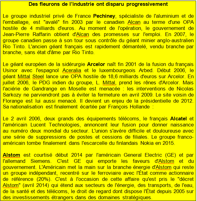 ° Des dates marquent cette désindustrialisation comme le déficit extérieur des produits industriels qui apparaît au milieu des années 2000. Mais on retiendra aussi les restructurations (disparitions) des grandes entreprises françaises dans les années 2006-2007, sans oublier les nombreuses délocalisations d’entreprises de taille plus petite.