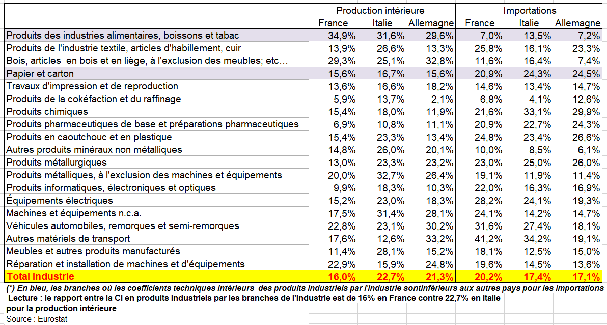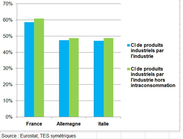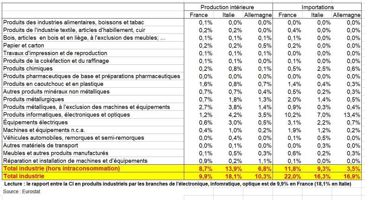En valeur les coefficients techniques en service par l’industrie en valeur – hors les transports car les transports de marchandises ne sont pas traités de la même manière en France et en Allemagne : marges de transport, CI en Allemagne (voire page Comptes transport) – sont à peu près au même niveau en France, Italie, Belgique et Allemagne. Les CI de services représentent 13% de la production industrielle en 2018 en France.