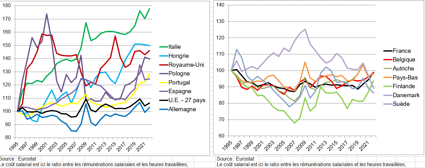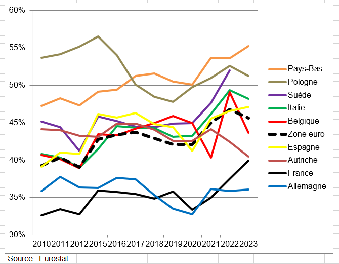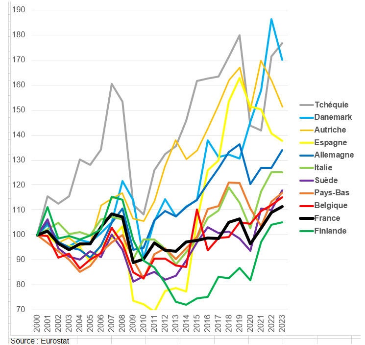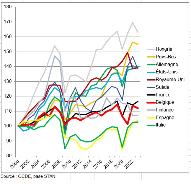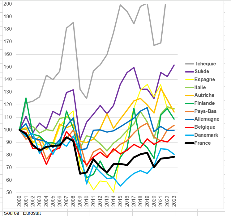Mais on ne retrouve pas cette baisse relative à partir de 2007 dans plusieurs pays : Allemagne (21,6% en 2007 comme en 2023), Pays-Bas, Tchéquie voire Italie. On se demande comment certains économistes parlent de désindustrialisation en Allemagne à moins d’une chute en 2024 .