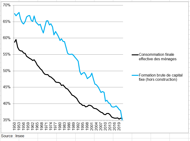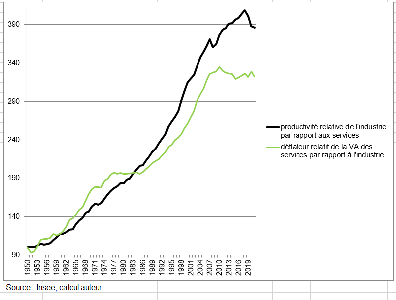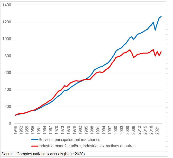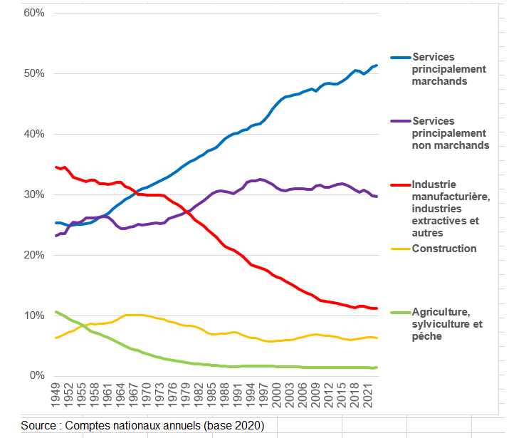 ° En France, la valeur ajoutée (VA) industrielle a progressé de +6 %/an entre 1950 et 1974 (+5,2% pour les services marchands) contre seulement +1,5%/an entre 1974 et 2019 (+2,4 %/an pour les services marchands dans la même période).
