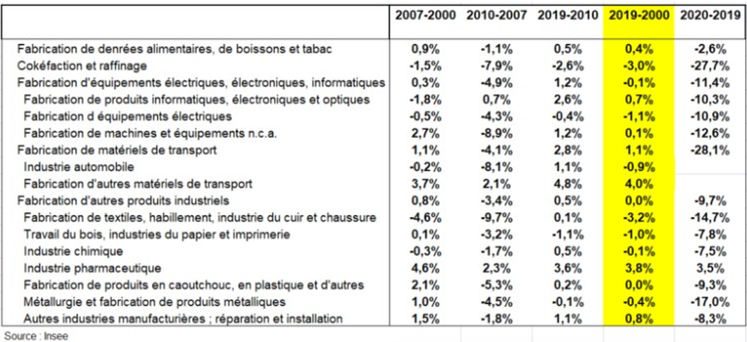 Le processus de désindustrialisation par pays est assez difficile à analyser en se référant aux comptes nationaux : la VA de l’industrie manufacturière en volume augmente de 0,9 % par an entre 2000 et 2019 en France. Mais la production en volume reste stable durant la même période.