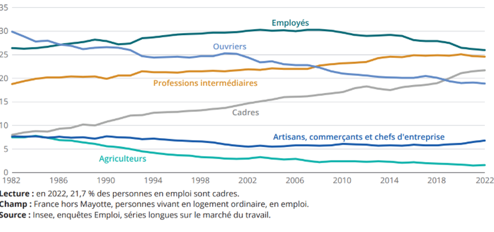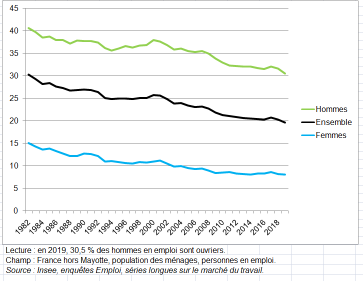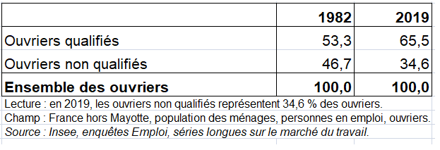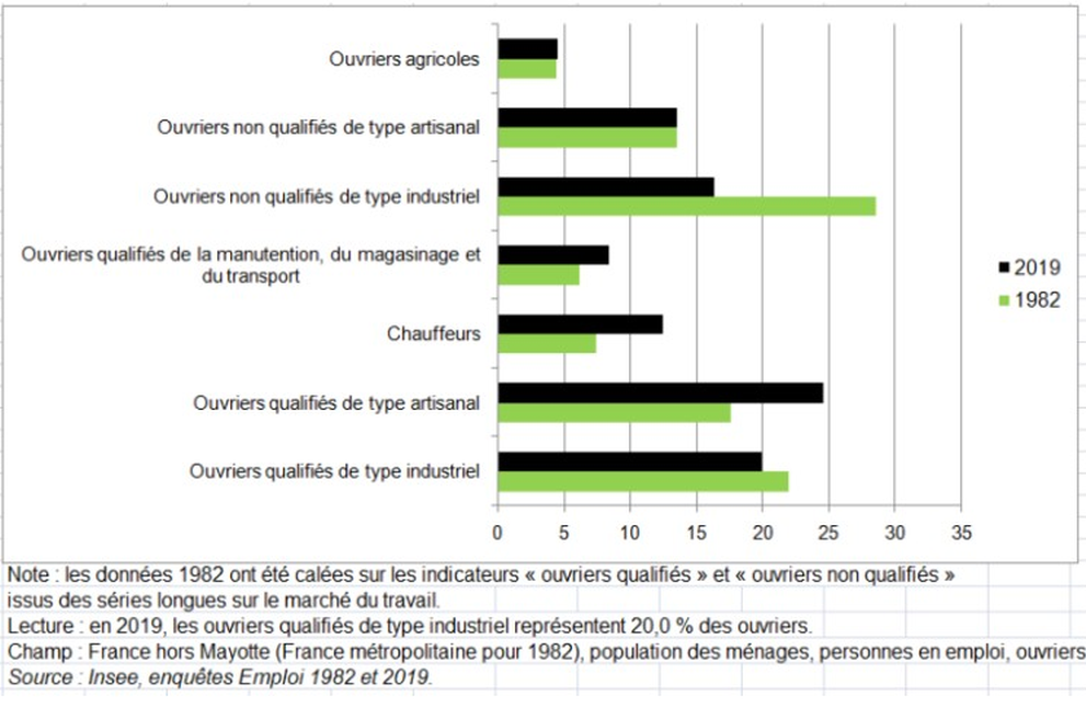 ° Mais c’est au début des années 2000 que l’économie française a perdu en compétitivité, compte tenu d’une forte augmentation du coût du travail et des prélèvements obligatoires, probablement du choix politique des 35 heures, puis du passage à l’euro et enfin de l’entrée dans l’UE des pays de l’Est de l’Europe. Au lieu de faire le choix d’une économie de l’offre, on a privilégié une économie de la demande, financée par la dette et génératrice d’un effondrement de la balance commerciale : nos importations dominant nos exportations. Dans les années 2000, 10 % des voitures vendues en France étaient produites à l’étranger contre 50 % aujourd’hui. Ainsi l’industrie automobile a perdu 100 000 emplois en 20 ans. Au final, du fait de cette contraction de l’offre ce sont des disparitions d’usines, des démantèlements de chaînes de montage et des licenciements massifs d’ouvriers. Moins de 20 % des personnes en emploi exerçaient en 2019 une profession d’ouvrier (dont 60% hors de l’industrie). En 40 ans, leur part a nettement baissé (– 10 points depuis 1982), reflet de la désindustrialisation, des délocalisations et des mutations technologiques (robotisation).
