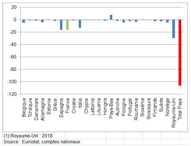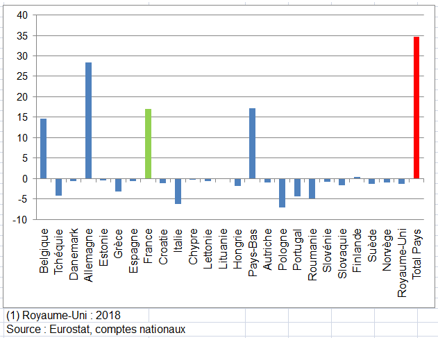 Mais c’est surtout le solde des échanges extérieurs de biens qui est devenu de plus en plus déficitaire depuis 2004. Au total, et après correction des coûts d’acheminement des importations entre les frontières (correction CAF-FAB), le solde commercial des produits industriels et de l’énergie est de -94 milliards d’euros en 2021 dont -62 Md€ de produits industriels (-10 Md€ par rapport à 2020) et -32 Md€ de produits énergétiques (-17,5 Md€ par rapport à 2020). Le déficit commercial de ces deux biens se creuse de 27,5 Md€. Les données des autres pays de l’UE sont publiées ci-dessous montrant un solde commercial excédentaire.