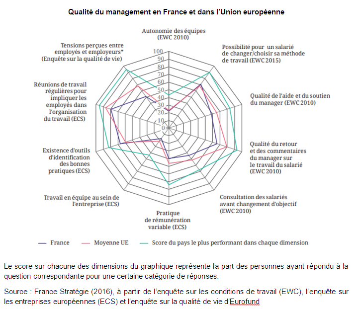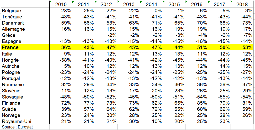 ° « La France s’est désindustrialisée, elle a perdu des parts de marché dans les exportations de la zone euro, et ses produits sont devenus moins compétitifs que ceux de ses principaux concurrents. L’exemple de l’automobile illustre ce décrochage spécifique de la France, fait de fermetures d’usines, de délocalisations en Europe de l’Est et en Afrique du Nord, à la différence de l’Allemagne, qui a su maîtriser sa chaîne de valeur, conserver sa production domestique tout en exportant et en s’implantant en Chine. On aurait pu donc s’attendre à ce que la France corrige ses faiblesses de compétitivité, adapte sa politique macroéconomique, s’engage dans les réformes structurelles tant différées et s’inscrive résolument dans une stratégie d’innovation ». Les grands groupes français ont fait le choix de se positionner sur le bas de gamme ou le milieu de gamme en délocalisant les usines et donc en sacrifiant l’emploi sur le territoire national [2].