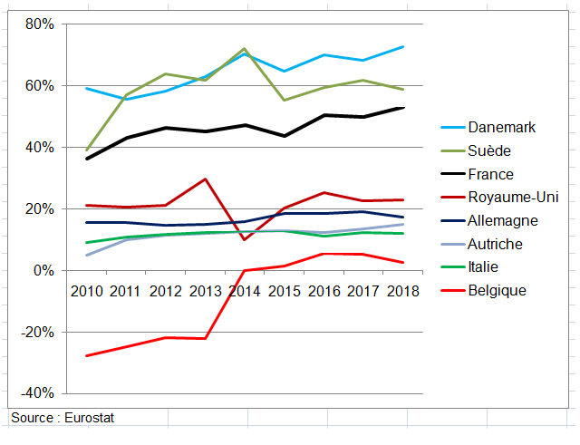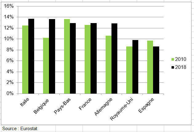 Mais ces mouvements ne se produisent pas qu’en France : en Italie, Belgique, Pays-Bas, Allemagne l’externalisation de services est du même ordre de grandeur su moins pour les services aux entreprises traités en consommations intermédiaires en comptabilité nationale (donc hors logiciel, R&D traités en FBCF et hors commerce traité en marge commerciale et non en CI).