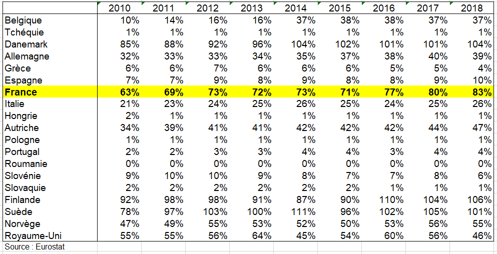 Ce tableau ne comprend pas la France d’une part parce que la France ne transmet pas à Eurostat une matrice de production produit-secteur d’activité. Cette matrice existe en France. Elle s’appelle la matrice secteur-branche. D’autre part, l’externalisation des services n’est pas vraiment comparable entre la France et les autres pays du fait que la France élabore un TES en branche pure alors que les autres pays font des TRE par secteur d’activité ou branche d’activité principale, (voir encadré suivant).