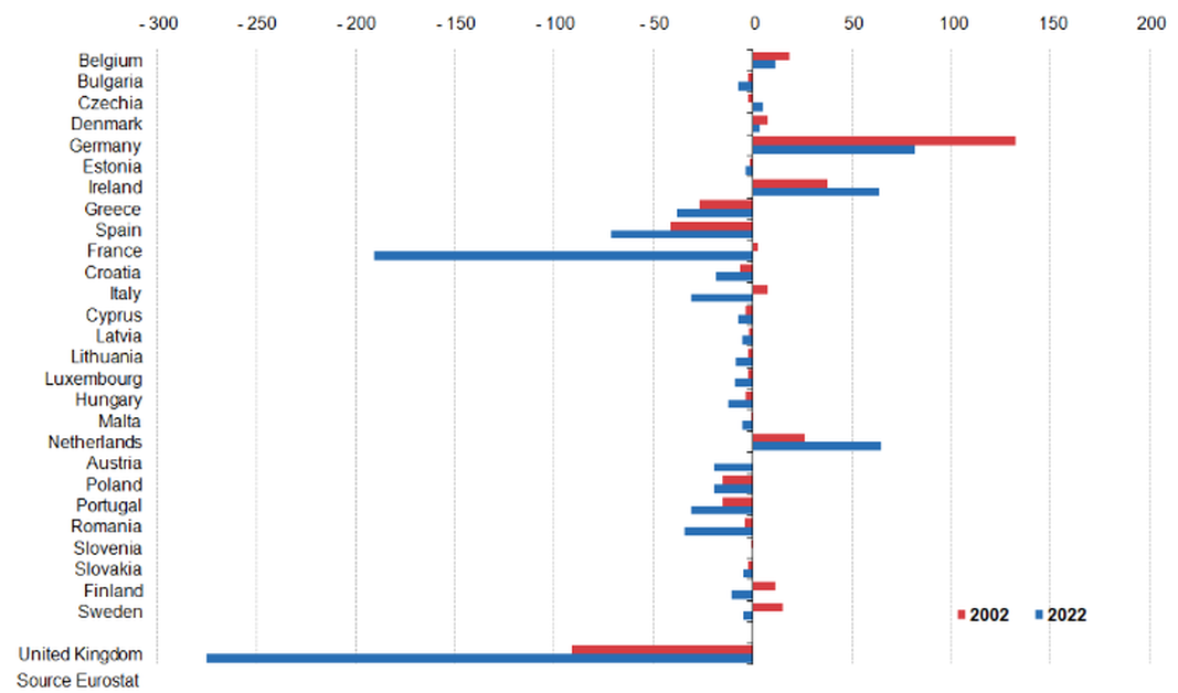 But above all it’s manufacturing trade balance that has become increasingly in deficit since 2004. Balance of trade CIF-FOB (after adjusting for the costs of transporting imports between borders, i.e..transit) in manufactured and energy goods is – 94 billion euro in 2021 of which– 62 billion euro of manufactured goods ( – 10 billion comparing to 2020) and – 32 billion euro of energy product (- 17,5 billion comparing to 2020). Trade deficit in these two goods increased by 27.5 billion in 2021. Figures of other countries in EU are below showing a positive trade balance.