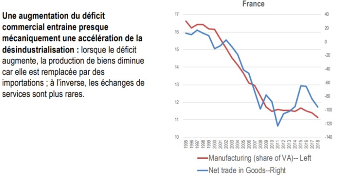 ° La dégradation du commerce extérieur est un symptôme de la désindustrialisation par pays : un pays sans industrie doit importer des biens. Mais elle en est également un facteur. L’aggravation du déficit concourt par elle-même à accélérer le mouvement de désindustrialisation. C’est cette accélération qui fait la spécificité de la France et du Royaume-Uni, car si la désindustrialisation par pays est quasi générale, y compris en Allemagne, elle les a touchés dans de moindres proportions.