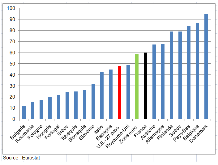 ° Quelques économistes ont analysé cette spécificité [1] (les nombres entre crochet renvoient à la bibliographie en bas de page). « Il existe une histoire spécifique du décrochage industriel français, qui a abouti au recul le plus important au sein de l’Europe. L’Union européenne (UE) reste globalement performante en matière industrielle si on en juge par les parts de marché, les brevets, les spécialisations. C’est la France qui a décroché notamment parce qu’elle n’a pas tiré les conséquences macroéconomiques de son passage à l’euro. L’Hexagone réussit moins bien que les pays de l’Europe du Sud dont la compétitivité coût est meilleure que la sienne, moins bien que les pays d’Europe centrale et orientale qui, forts de leurs atouts en capital humain et de leur proximité avec l’Allemagne, ont une stratégie de pays émergents. La France est également en retrait par rapport à l’Allemagne et aux pays nordiques qui, grâce à leurs efforts de recherche et développement (R&D) et de montée en gamme, ont amélioré leur compétitivité hors coût« .