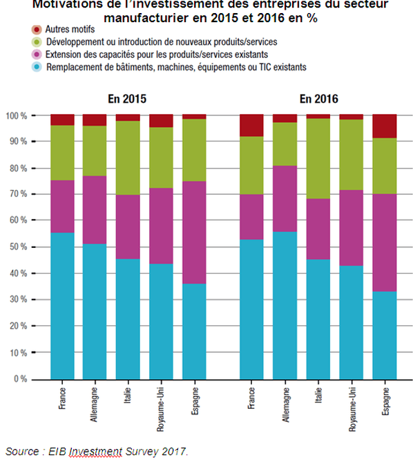 Des études de France Stratégie et La Fabrique de l’industrie formulent une hypothèse originale [9] : « Les entreprises françaises mettent bien davantage de moyens que leurs concurrentes dans l’investissement immatériel au sens large, tout d’abord dans les logiciels (qu’ils soient comptables, RH, pour modéliser une production, etc,..). À l’inverse, le niveau d’investissement hexagonal en machines et équipements serait plus faible que celui des autres pays européens ».
