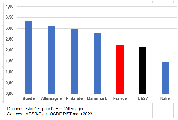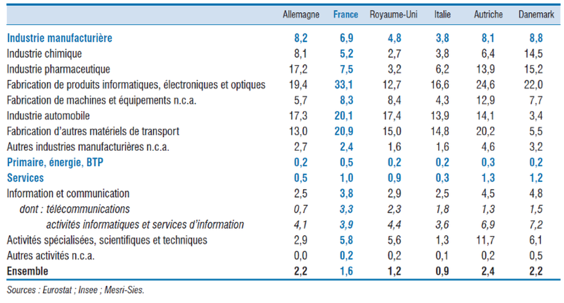 Ainsi, si l’effort de recherche des entreprises en Allemagne est supérieur de 0,6 point à celui des entreprises en France, cela provient principalement d’un effet de structure économique (+ 1,3 point). La structure économique de l’Allemagne est en effet plus favorable à un effort de recherche élevé, puisque les activités particulièrement intenses en R&D y occupent une place plus importante. C’est notamment le cas de l’industrie automobile, avec un effet de structure de 0,7 point. En revanche, l’effet d’intensité joue de manière négative sur l’effort de recherche des entreprises en Allemagne par rapport à celui des entreprises en France, et ce, à la fois dans les services (– 0,4 point) et l’industrie manufacturière (– 0,1 point).