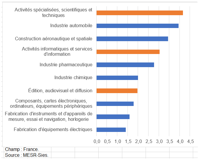 Intensité de recherche sectorielle en 2015 en % de leur valeur ajoutée
