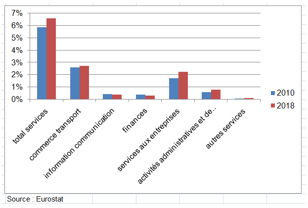 Il reste que la part de la production des activité secondaire de services des secteurs de l’industrie n’a cessé de progressé dans les différents pays étudiés entre 2010 et 2018 même si le coefficient technique des services par l’industrie a lui aussi augmenté. Les Pays-Bas font exception : stabilité du coefficient technique et baisse de la part des activités secondaires de services dans la production des secteurs de l’industrie.