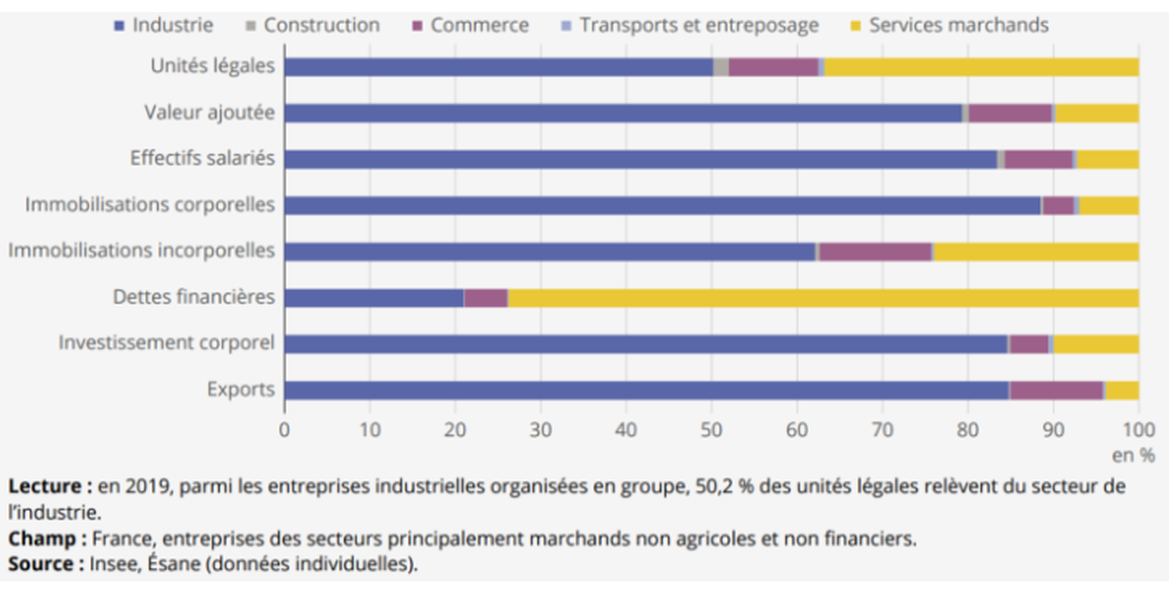 Mais les stratégies d’entreprises en matière de diversification s’observent mieux au niveau des groupes industriels (et non au niveau des UL) qui créent des filiales de services. En 2019, la moitié des UL des entreprises industrielles organisées en groupe appartiennent ainsi au secteur tertiaire (graphique suivant). Ces UL du tertiaire pèsent pour 20 % de la valeur ajoutée du secteur de l’industrie, ainsi que 15 % des investissements et des effectifs salariés du secteur. Les UL du secteur des services marchands représentent à elles seules les trois quarts de la dette financière (58 % pour les holding et sièges sociaux).