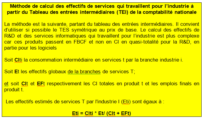 Comme déjà dit, les dépenses en R & D sont comptabilisées comme des dépenses d’investissement et non comme des dépenses de consommations intermédiaires. Compte tenu de l’importance des dépenses de R & D dans l’industrie, on peut vouloir intégrer les emplois correspondants aux services à l’industrie déjà identifiés. En 2016, les branches industrielles réalisaient 50 % de la dépense intérieure de recherche et de développement (DIRD). .On peut considérer que la moitié des emplois de la branche « recherche-développement scientifique » – soit un effectif de 218 000 – sont rattachables aux services à l’industrie.